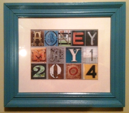 I could have sent it out to be printed in a photo lab, but I am all about instant gratification. I printed it off on my printer with plain paper. It looked great! Then, I stopped by my local thrift store and grabbed an 11X17 awful gold frame with a white mat and a terrible lovely cherub print. The price was right at $3.50. The print went into the trash and the frame got a quick coat of Bahama Sea spray paint by Krylon that was hanging out in our garage.